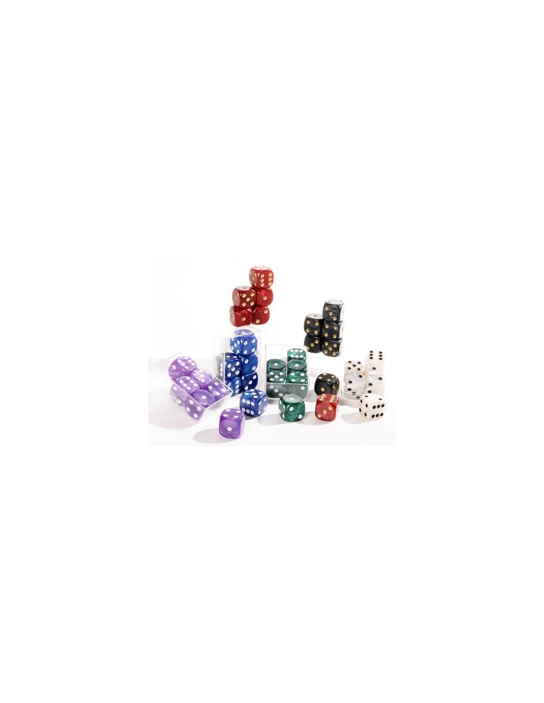 Zes dobbelstenen van één kleur in transparant plastic doosje.